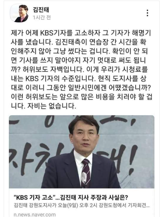 명확한 답변을 하지 않으니까 기자는 더 의혹을 갖는 법이다. 기자는 나름대로 확인 취재를 했는데도 이에 답변하지 않고서는 '오보'라며 해당기자를 고소? 김 지사도 언론 소통과 대응에 심각한 하자가 있다. 항상 느끼는 거지만. 인물은 괜찮다고 알고 있지만.