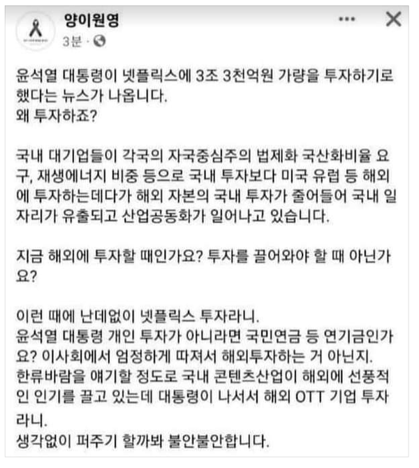 미국 국빈방문 중인 윤석열 대통령이 첫 공식 일정으로 만난 테드 서랜도스 넷플릭스 공동 CEO로부터 향후 4년간 25억 달러(3조3천억) 투자 유치를 했다는 보도가 나오자, 민주당 양이원영 의원은 페이스북에 “윤석열 대통령에 넷플릭스에 3조3천억가량 투자하기로 했다는 뉴스가 나온다. 왜 투자하죠? 대통령이 난데없이 투자라니 투자를 끌어와야 할 때가 아닌가요”라는 내용의 글을 올렸다.