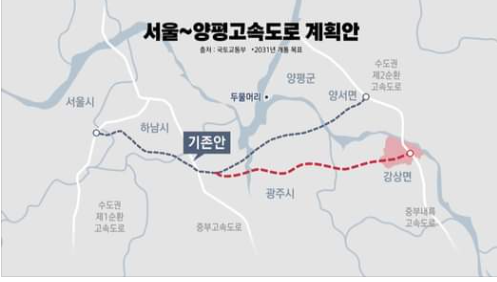 양평군민 전체가 11만이고 양평군이 꽤나 넓어서 해당 고속도로 덕 보는 사람은 5만도 안 되는데(양평 남쪽은 광주원주 고속도로가 지나간다), 이 사람들 보고 1조 수천억원 짜리 고속도로 만들자는 주장이 가당키나 하겠나.