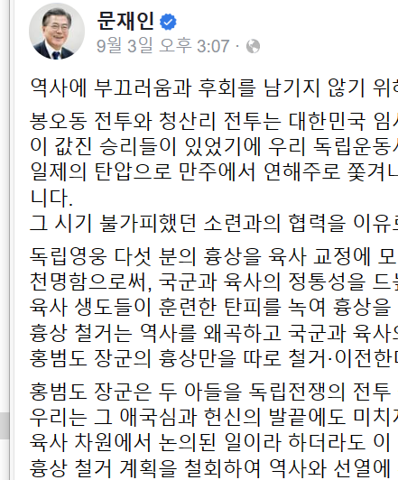 문재인 전 대통령이 육사 내 홍범도 장군 흉상 철거와 관련해 “육사 역시 신흥무관학교를 뿌리"이라고 주장했을 때, 본지(9월 4일자)는 “문재인의 해괴한 '정신승리' 학설”이라고 비판했다.