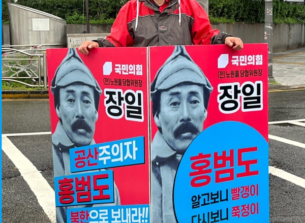 사진은 노원을 전 당협위원장(장일)의 1인 시위 모습이다.  피켓에는 '공산주의자 홍범도, 북한으로 보내라'  '홍범도 알고보니 빨갱이 다시 보니 쭉정이'라고 쓰여있다.