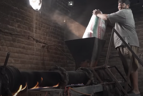 흔히 플라스틱 공장이라고 하면 사출을 많이 생각하는데, 사출은 녹인 플라스틱을 금형에 넣어 바가지 등을 찍어내는 것이고, 압출은 비닐 하우스 등에 쓰이는 비닐을 생산하는 것이다. 폐 플라스틱을 녹이는 게 아니고 고밀도 폴리에틸렌(High-density polyethylene) 소재를 녹인 투명한 플라스틱 튜브에 공기를 넣어 끌어내리는 과정을 거친다. 건물 5층 높이의 거대한 기계가 투명한 비닐 주머니를 끌어내리며 생산한다.