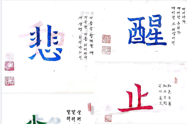 해마다 연초에 새해를 품어갈 한 글자를 써서 나누는 것이다. 이렇게 그동안 새겨 보낸 글자가 올해의 비(悲 2024년), 성(省 23년), 성(醒 22년), 지(止 21년), 공(共 20년), 서(恕 19년) 등인데, 올해의 비(悲)와 함께 하는 '자(慈)'를 새겨보낸 해가 2014년이니, ‘자(慈)’와 ‘비(悲)’가 하나임을 깨닫는 것에 10년이 걸렸다고 할 수도 있으리라 싶다.