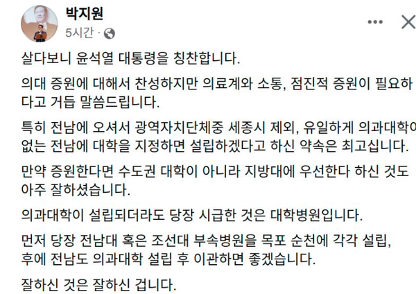 박지원 후보는 “만약 증원한다면 수도권 대학이 아니라 지방대에 우선한다 하신 것도 아주 잘하셨다”며 “의과대학이 설립되더라도 당장 시급한 것은 대학병원이다. 먼저 당장 전남대 혹은 조선대 부속병원을 목포, 순천에 각각 설립, 후에 전남도 의과대학 설립 후 이관하면 좋겠다”며 아예 세부 계획까지 내놓았다. 그러면서 “잘하신 것은 잘하신 것”이라며 거듭 윤 대통령을 치켜세웠다.