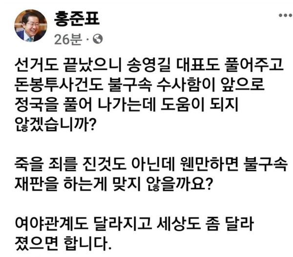 여야 관계가 달라져야 하니까, 사법부가 법과 사법적 양심에 따라 구속시킨 송영길을 꺼내주자니. 홍준표 아재요. 요즘 왜 이라능교.
