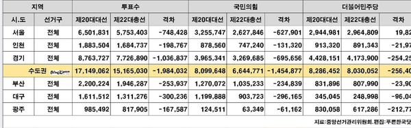 이번 총선 수도권 투표자수가 지난 대선에 비해 198만 4032명이나 기권했다.국민의힘 지지자들은 1,454,877명이 기권했고 더불어민주당 지지자들은 256,400명이 기권했다. 특히 서울에서는 더불어민주당 지지자들은 지난 대선보다 19,828명이 더 투표장에 나왔다.