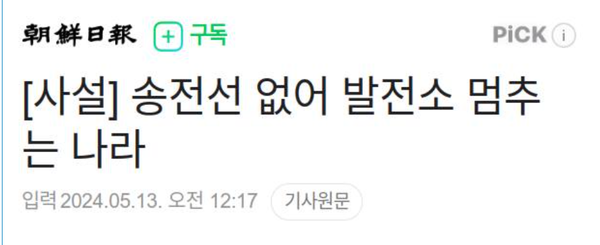 조선일보의 사설은 처음부터 끝까지 모든 것이 '문재인 탓, 민주당 탓'이라고 선동하고 있다. 문재인 시절에 송전선로 건설을 추진하지 않은 것이 아니다. 민원 때문에 좌초 했을뿐이다.