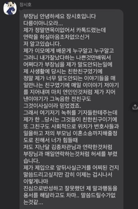 장씨는 같은 달 26일 문자에서는 “제가 이모(최순실)에게 배운 게 누구 알고 누구 알고 그러니 내가 잘났다 하는 나쁜 것만 배워서 어쩌다가 부장님을 제가 말도 안 되는 일에.(...) 마치 연인인 것처럼 제가 지어낸 이야기(...) 진심으로 반성하고 오해를 풀어드리고 싶으나 연락조차 전화조차 겁나서 이렇게 사실적인 모든 상황을 거짓 하나 없이 고해드립니다”라고 했다.