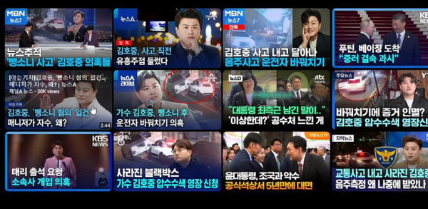 썸네일 16개 중에서 9개가 김호중이구나. 옆으로 주욱 내려가는 썸네일에는 55개가 김호중 뉴스로 도배되다. 흠~~ 이것은 '김건희 명품백' 사건 이슈를 흐릿하게 만들려는 음모가 분명하다. '특검 전문당' 민주당은 구경만 하고 뭐하고 있나. 김호중 사건도 특검해라!
