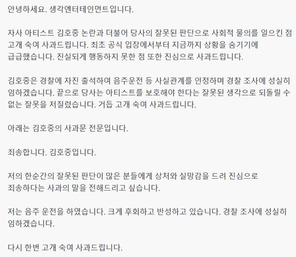 김호중 소속사 생각엔터테인먼트도 “자사 아티스트 김호중 논란과 더불어 당사의 잘못된 판단으로 사회적 물의를 일으킨 점 고개 숙여 사과드린다”며 “최초 공식 입장에서부터 지금까지 상황을 숨기기에 급급했다. 진실되게 행동하지 못한 점 또한 진심으로 사과드린다”고 말했다. 그동안 소속사는 김호중의 음주운전을 거듭 부인해왔다.