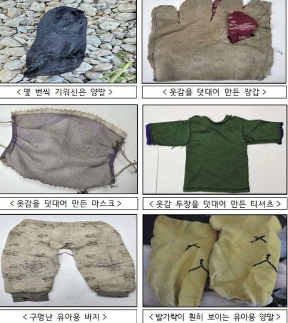 위 사진은 북한발 오물풍선 속 오물들이다. 몇번씩 기워 신은 양말, 옷감 덧대어 만든 마스크, 옷감 덧댄 티셔츠... 눈물 난다. 이게 그 유명한 '가난 포르노'인가.