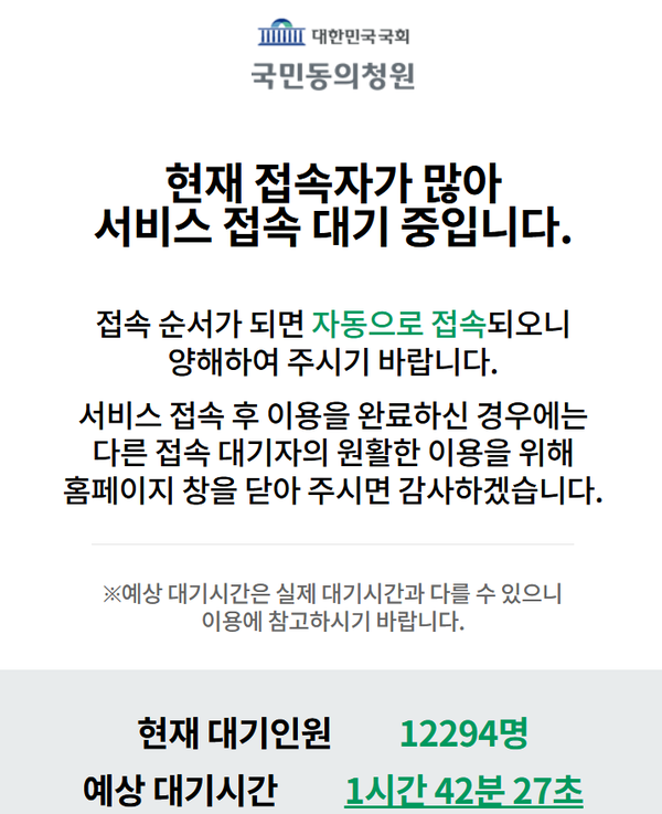 이때문에 국회 청원 페이지는 접속 폭주로 계속해서 지연이 나타나고 있다. 청원 동의를 하기 위해 평균 1만명 이상 대기하고 있는 중이다. 100만 돌파가 눈앞인데 국회 웹사이트 서버가 문제인 셈이다.