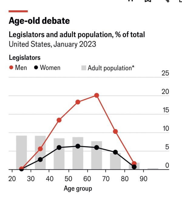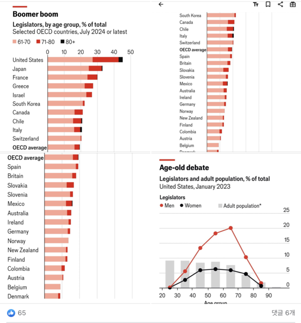 OECD 국가의 61세 이상의 의원들의 비중을 보면 2위 일본, 한국은 6위로 나이가 많은 편에 속한다. 미국이 압도적으로 높다. 신인들에게 불리한 선거 제도도 한몫 하고 한국, 일본의 '나이 중시 문화'도 영향이 있을 것이다.