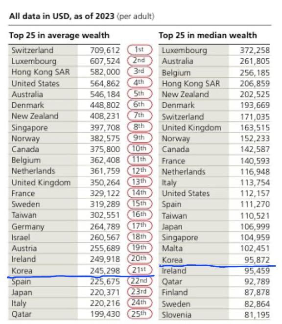 USB의 부에 관한 2024년 보고서에 성인 1인당 갖고 있는 부(물가를 고려하지 않는 달러로 표시한 금액)의 자료에 의하면 대한민국은 평균이며, 21위다. 중위 값(부의 크기에 따라 순서를 정했을 때 가장 가운데 있는 사람의 부)는 20위다.