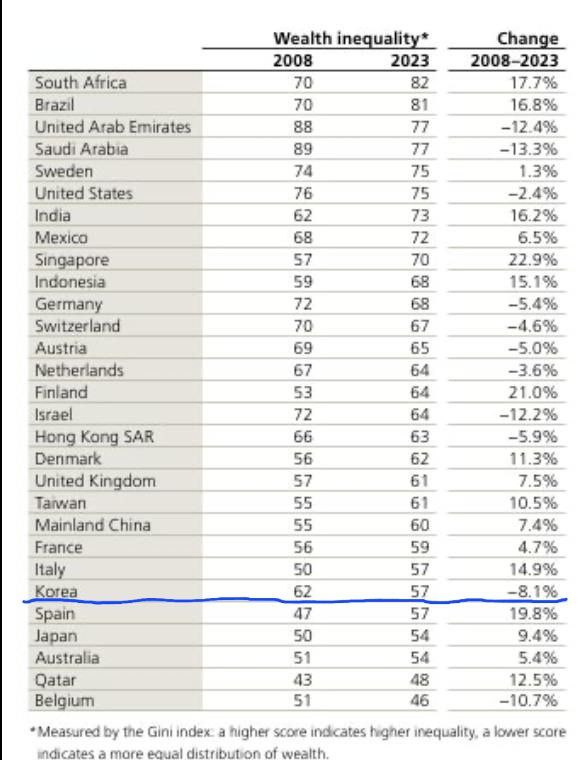 2008-2023년의 빈부 격차(소득이 아니라 보유 부를 기준으로 한 측도)를 지니 계수의 변화로 보면 한국이 지니계수가 -8.1% 감소해서 부의 격차가 줄었다는 것을 보여준다.