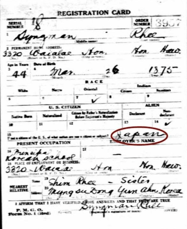 그래서 이승만도 미국 체류시절 자신의 국적을 'Japan'이라고 쓴 것이다. 정치 철학에 정통했던 이승만이 '친일'이어서 그렇게 일본이라고 표기했겠나.