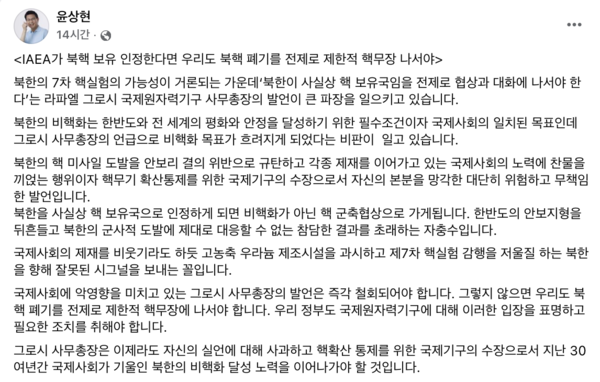 다음은 윤 의원의 글 ‘IAEA가 북핵 보유 인정한다면 우리도 북핵 폐기를 전제로 제한적 핵무장 나서야’의 전문이다.