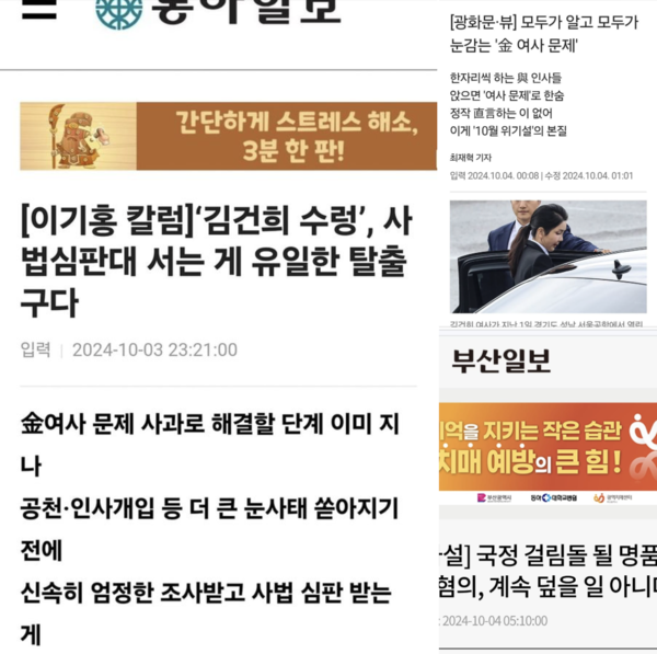신문 사설들이 윤 정부가 ‘김건희 늪’에 빠졌다고 걱정한다. 이걸 부인하는 사람들은 아마도 ‘윤빠’에 속한 소수일 것이다. 여전히 '몰카 희생양'이라는 이야기와 야당의 마녀사냥의 억울함에 동조한다. 물론 한심한 생각들이다.