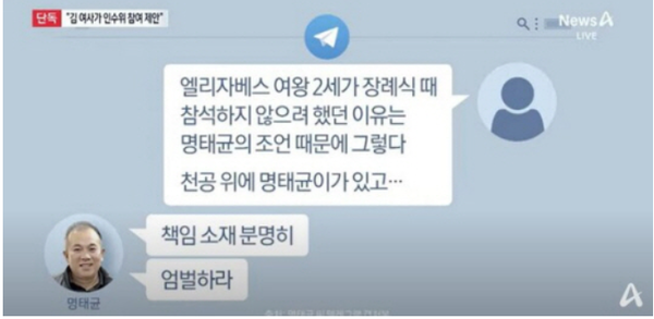 그러면서 아래의 텔레그램 캡처본도 추가로 공개했다. 2022년 9월 김 여사가 보낸 것으로 돼 있는 메시지는 "엘리자베스 여왕 장례식에 불참하려던 이유가 명태균 조언 때문이라는 소문이 돈다"였고, 명씨는 "책임 소재를 분명히" "엄벌하라"고 답장을 보낸 것이다.