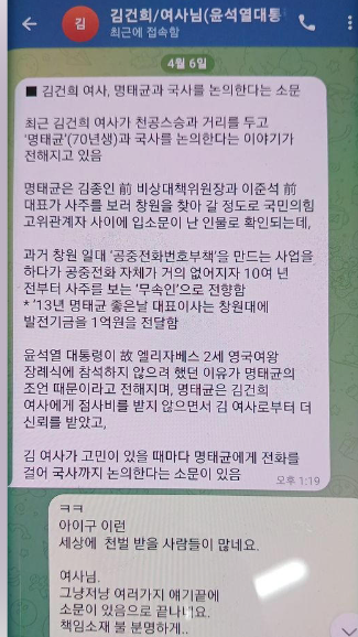 김여사가 보내준 이 지라시 내용에, 명태균씨는 “ㅋㅋ 어이구 이런. 세상에 천벌 받을 사람들이 많네요. 여사님, 그냥저냥 여러 가지 얘기 끝에 소문이 있음으로 끝나네요, 책임 소재 불분명하게”라고 답했다.