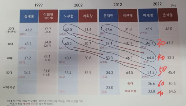 노무현 때 20대였던 40대는 크게 변동없이 60%가 넘는 비율로 민주당 후보를 일관되게 지지한다. 이 정도면 '닥치고 민주당'이다. 50대도 40대엔 못 미치지만 민주당 지지가 늘 과반이 넘는다.