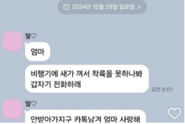 사고가 난 무안공항 제주항공 여객기에 탑승한 여자 승객이 마지막으로 어머니에게 보낸 카톡 메시지가 공개됐다.
