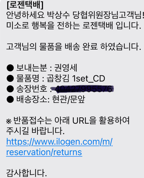 문자가 왔다. 당협위원장에게 보낸 권영세 위원장의 설 선물 곱창김. 꼬불꼬불한 곱창김은 일반김보다 맛있다 한다.
