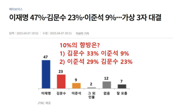 각 당에서 후보로 확정될 가능성이 높은  3자 가상대결에서 이재명 47%, 김문수 23%, 이준석 9% 로 나왔다. 여론조사기관 메타보이스가 JTBC 의뢰로 지난 5~6일 전국 성인 남녀 1,011명(무선 100%, 휴대전화 가상번호 이용)을 대상으로 실시한 조사 결과다.  표본오차는 95% 신뢰수준에 ±3.1%포인트, 응답률은 16.5%였다.