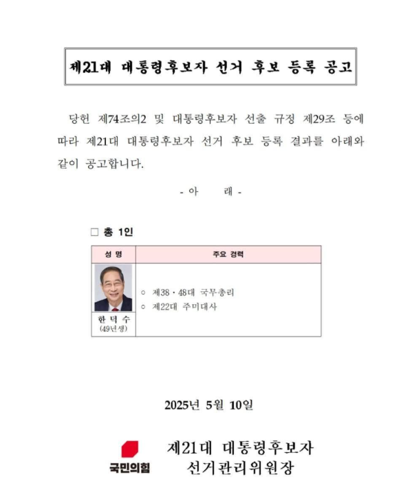 당권파는 10일 중으로 '새로운 단일 후보' 한덕수에 대한 전당원 찬·반 여론조사를 진행한 뒤, 전국위원회 의결로 당의 최종 대선 후보를 확정한다는 계획이다.