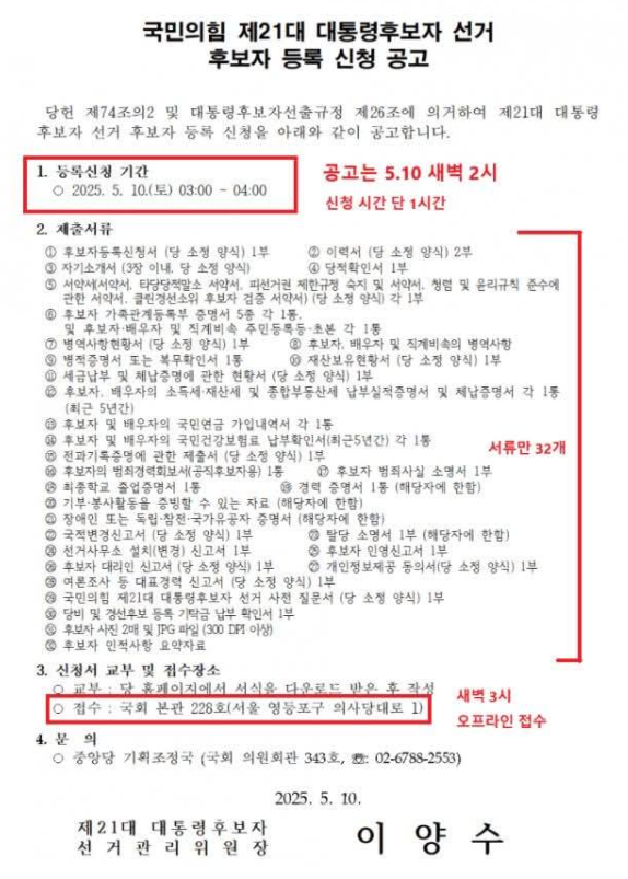 특히 흥미로운 점은 한덕수 후보로의 바꿔치기 수법이다. 국민의힘 당규에는 후보 등록 시간은 '오전 9시부터 오후 5시'까지로 규정돼 있다고 한다. 하지만 아래 공고문(붉은 점선)을 보면 바로 이날 '새벽 3시부터 4시'까지로 되어있다. 한덕수 쪽에 이 계획을 알려주고 미리 방대한 양의 신청서류(32가지)들을 준비시켜놓았던 것이다. 당권파는 이런 꼼수를 쓰는 자신들이 몹시 똑똑하다고 여길 것이다.