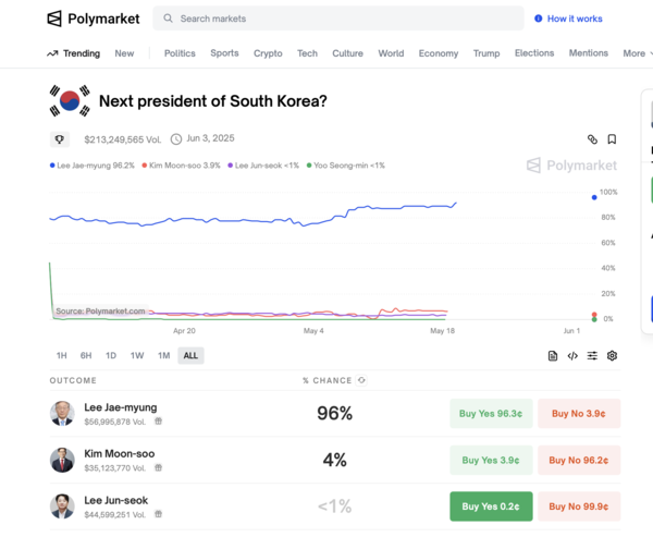 전세계 사람들이 베팅하는 사이트 '폴리마켓'의 대선 당일 3일 오전 10시 현재 ‘이재명 당선’에 96% 확률을 걸었다. 하루 전보다 1%p 올랐다. 김문수 후보의 당선 예측은 4%다.