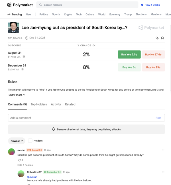 4일 폴리마켓에는 ‘이재명 대통령은 언제 물러날까?’, ‘이재명은 2025년에 탄핵될까?’, ‘이재명은 2025년에 수감될까’ 등 3가지 베팅 주제가 새로 게시되었다.