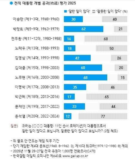 Yoon Suk-yeol 77%, Chun Doo-hwan 68%, Park Geun-hye 65%, Roh Tae-woo 50%, Lee Myung-bak 46%, Moon Jae-in 44%