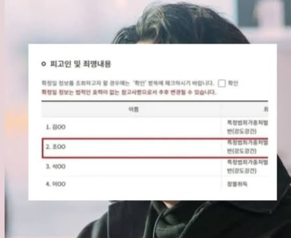 만약 이 화면의 ‘조OO’이 조진웅이라면, 조진웅은 강도강간죄로 특정범죄가중처벌법 적용을 받았고 가정법원이 아닌 일반 형사재판을 받았다고 추정된다.