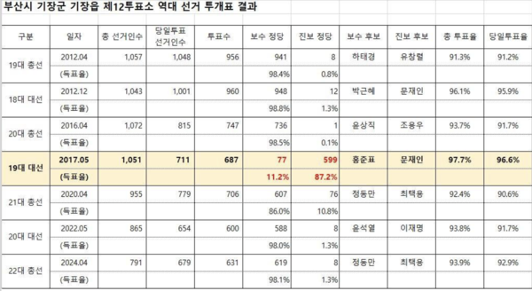 이 기장읍 제12투표소의 역대 선거의 당일투표 개표결과는 첨부하는 표와 같다.