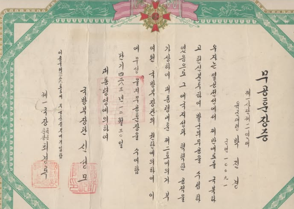 위 사진은 1950년 이승만 대통령의 지시에 의해 박진경 대령이 받은 을지무공훈장 원본입니다. 오늘 따라 이승만 대통령의 혜안이 더욱 크게만 느껴집니다.