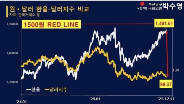 환율이 오르는 건 국격이 무너지고 있기 때문이다. 이재명 정권 하에서 우리나라의 미래가 어둡다고 생각하기 때문에 국민도, 기업도, 외국 자본도 우리나라를 외면하는 것이다.