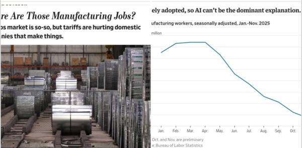 최근 발표된 미 노동통계국에 의하면 금년들어 11월까지 5만 8,000개의 제조업 일자리가 줄었고 10~11월 최근 두 달 사이에 1만 9,000개가 줄어서 제조업 일자리 감소가 가속화되는 양상을 보이고 있다.