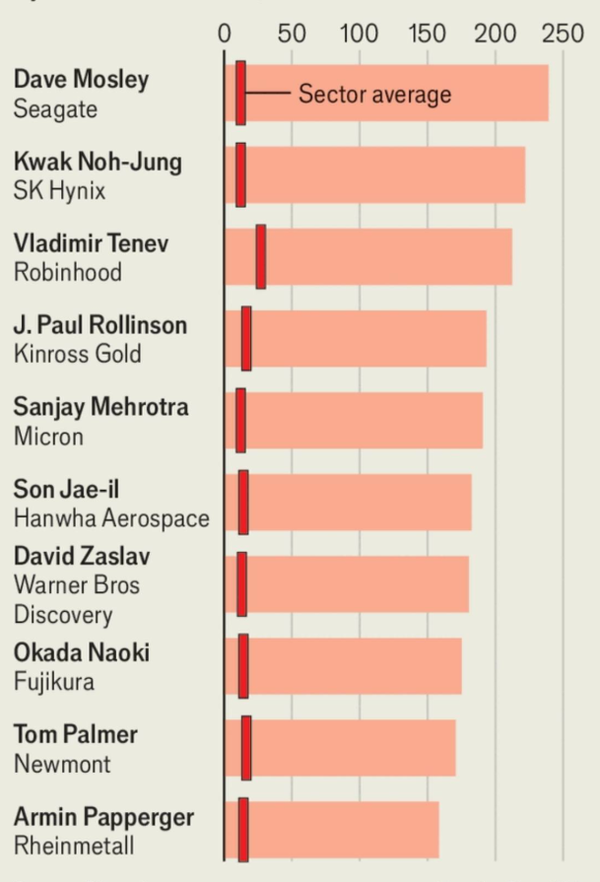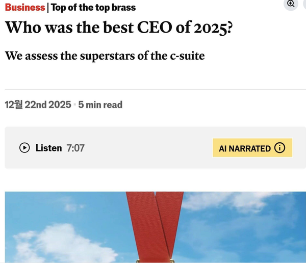 2위가 SK 하이닉스의 곽노정 CEO와 6위의 한화 에어로스페이스 손재일 대표다. 한국 증시가 금년에 세계 최고 수준에서 상승했고 반도체와 방산이 질주한 해라는 것을 상징한다.