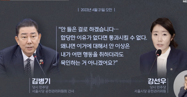 당시 김 원내대표는 강 의원에게 “안 들은 걸로 하겠다”라며 “합당한 이유가 없다면 통과시킬 수 없다”고 마무리했다. 하지만 김경 의원은 민주당의 서울시의회 의원 후보로 공천됐다.