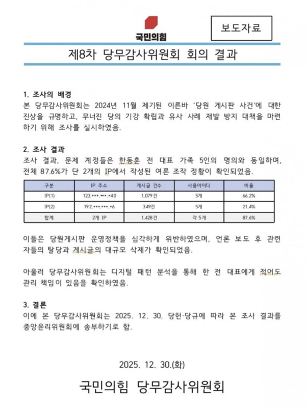 이에 앞서 국민의힘 당무감사위는 이날 한 전 대표 관련 '당원 게시판 의혹' 조사 결과를 발표했다. 한 전 대표 가족 명의의 5개의 ID를 활용해 2개의 IP에서 1428건의 글이 작성됐다고 밝혔다. 한 전 대표 및 그 가족 명의의 계정이라는 것이다.