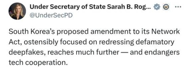 사라 로저스 미 국무부 공공외교 차관은 30일(현지시간) 엑스(X·트위터)에 "한국의 네트워크법(Network Act) 개정안은 표면적으로는 명예를 훼손하는 ‘딥페이크’ 문제를 바로잡는 데 초점을 둔 것처럼 보이나 실제로는 훨씬 더 광범위한 영향을 미치며 기술 협력을 위태롭게 한다"라는 글을 올렸다