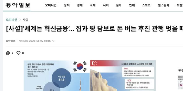 동아일보 2일자 기사와 관련 사설에서 싱가포르는 벤처 혁신 기업에 투자하는데 한국 금융은 주담보 대출에 집중하고 있다고 쓰고 있다.