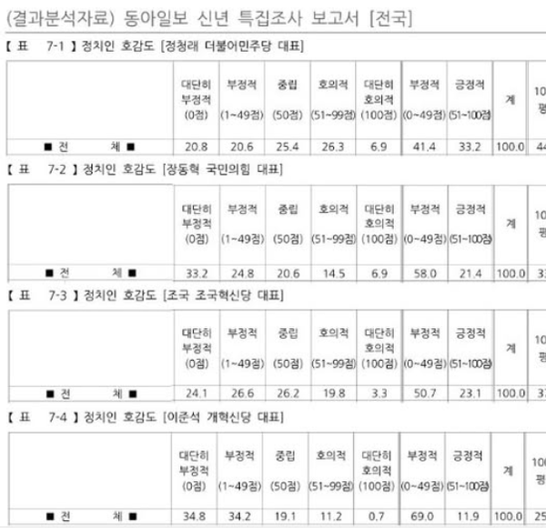 성적표는 정청래(44.1점) 조국(37.2점) 장동혁(33.6점) 이준석(25.7점)입니다. 4명 모두 50점 미만으로 민심이 얼마나 싸늘한지 보여줍니다.