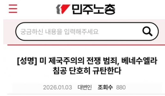 내가 알기에 민노총은 분명 노동조합연맹인데, 대문에는 '미 제국주의 전쟁 범죄, 베네수엘라 침공 규탄'이라는, 평양 방송이나 카라카스 외교부에서나 나올 법한 성명서가 걸려 있다.