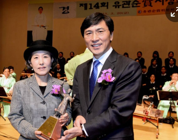 At the time, a lawmaker identified here asMs. Lee, who was serving as chair of the Yu Gwan-sun Memorial Foundation, called me. Before picking up the phone, I did not even know that she was the chair of the foundation. The presenter of the award had been Ahn Hee-jung, then governor of South Chungcheong Province, so I had no reason to know.