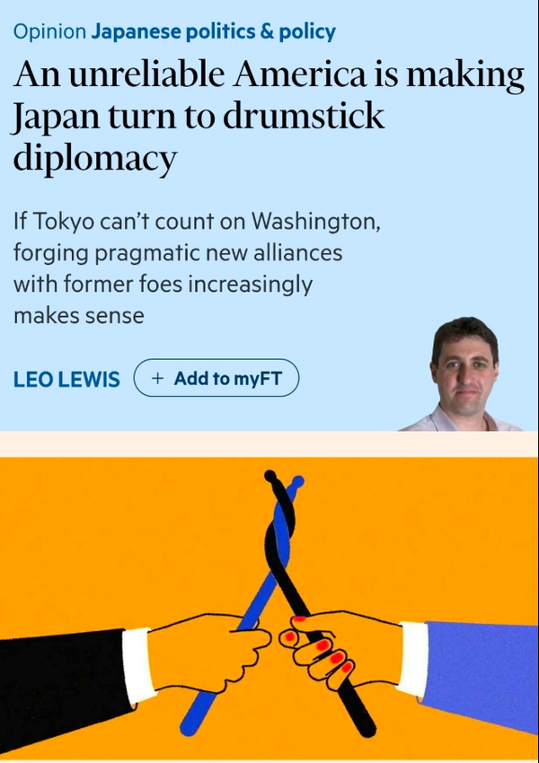 우리를 둘러싼 국제질서 급변에 대해 예리한 관점을 보여준 FT의 <믿을 수없는 미국이 일본으로 하여금 드럼스틱 외교로 돌려놓고 있는 중>이라는 제목의 기사 전문을 소개한다.