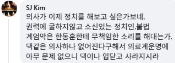 한동훈 전 대표에 대해 비판적인 글을 썼다고 한동훈 지지자가 이런 댓글을 다셨는데, 이런 글을 웃어 넘길 수 있는 면역력 또는 맷집을 갖게 된 것에 감사하고 다행스럽게 생각한다.