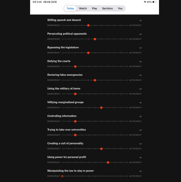 그렇다면 독재냐 아니냐를 어떻게 판단할 수 있을까? 뉴욕타임즈가 민주주의에서 권위주의 (독재)로 퇴행하는 모습을 연구자들의 도움으로 12가지 패턴을 찾아서 측정 지표로 만들었다.