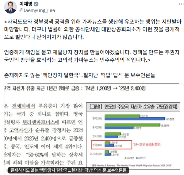 On the 7th, President Lee Jae-myung publicly rebuked as “deliberate fake news” a press release issued by the Korea Chamber of Commerce and Industry (KCCI)that cited research by the British investment-immigration consultancy Henley & Partnersclaiming South Korea ranked fourth worldwide in the outflow of wealthy individuals. After that post on X (formerly Twitter), a truly bizarre spectacle began to unfold.
